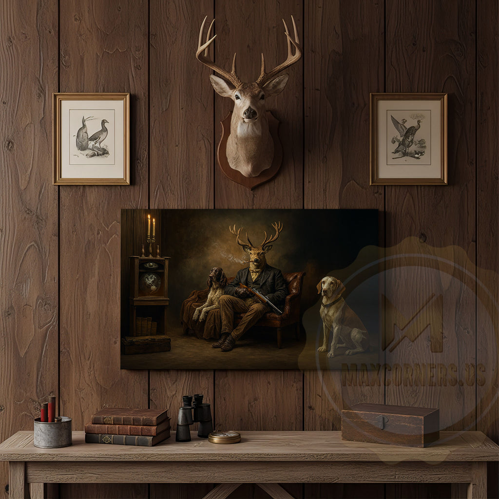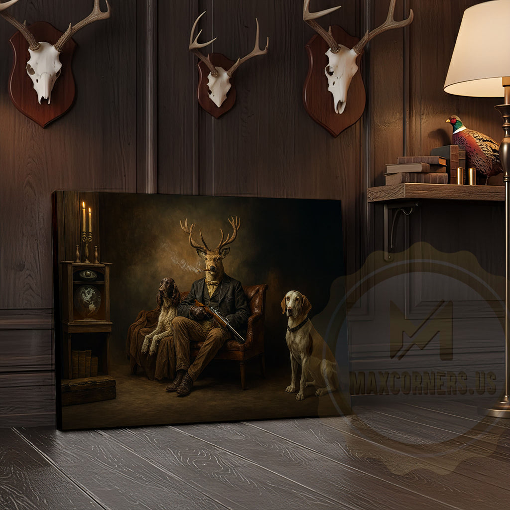 Maxcorners Deer Gentleman with Hunting Dogs in Rustic Room Wrapped Canvas