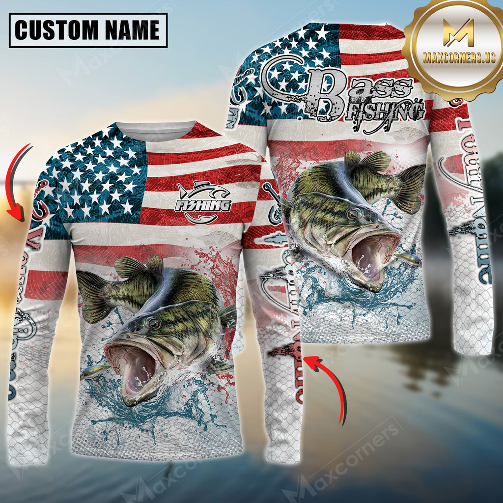 Maxcorners Bass Fishing American Flag Splash Design Personalized Name, Team Name 3D Long Sleeve Shirt