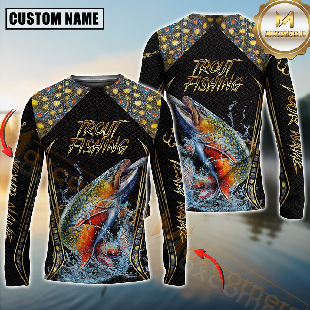 Maxcorners Golden Trout Fishing Shirt Jumping Fish Design Personalized Name, Team Name 3D Long Sleeve Shirt