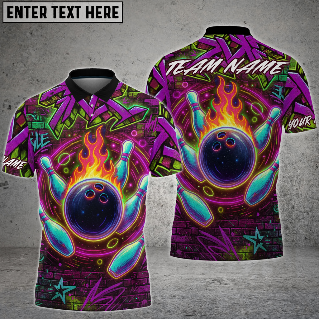 Maxcorners Bowling Shirt Neon Graffiti Bowling Flame Multioptions Personalized Name, Team Name Unisex 3D Shirt (4 Colors)