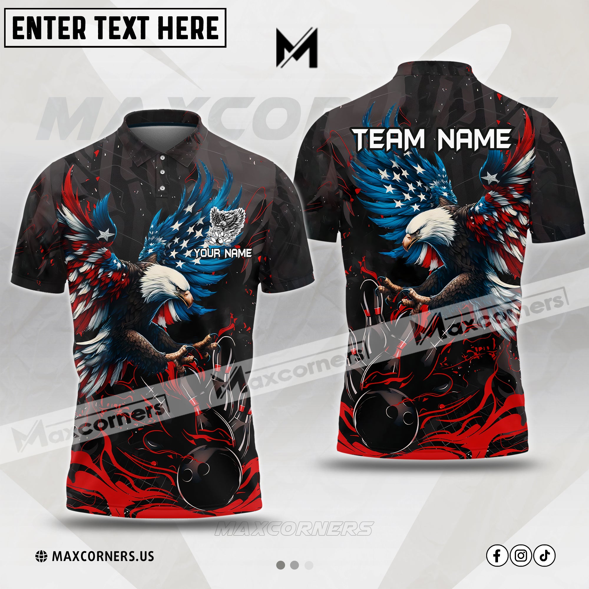 Maxcorners Bowling Almighty American Eagle US Flag Multicolor Customized Name 3D Polo Shirt (4 Colors)